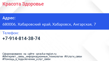 Красота & Здоровье по адресу 680006, Хабаровский край, Хабаровск, Ангарская, 7 в дальнейшем Организация, размещена в следующих категориях: