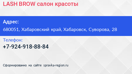 LASH & BROW, салон красоты по адресу 680051, Хабаровский край, Хабаровск, Суворова, 28 в дальнейшем Организация, размещена в следующих категориях:
