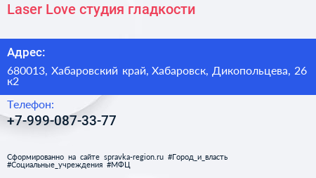 Laser Love, студия гладкости по адресу 680013, Хабаровский край, Хабаровск, Дикопольцева, 26 к2 в дальнейшем Организация, размещена в следующих категориях: