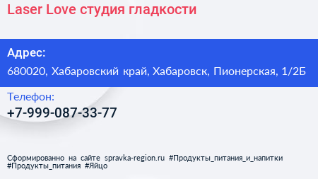 Laser Love, студия гладкости по адресу 680020, Хабаровский край, Хабаровск, Пионерская, 1/2Б в дальнейшем Организация, размещена в следующих категориях: