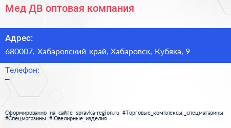 Мед ДВ, оптовая компания по адресу 680007, Хабаровский край, Хабаровск, Кубяка, 9 в дальнейшем Организация, размещена в следующих категориях: