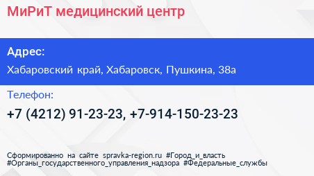МиРиТ, медицинский центр по адресу Хабаровский край, Хабаровск, Пушкина, 38а в дальнейшем Организация, размещена в следующих категориях: