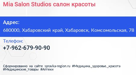 Mia Salon-Studios, салон красоты по адресу 680000, Хабаровский край, Хабаровск, Комсомольская, 78 в дальнейшем Организация, размещена в следующих категориях: