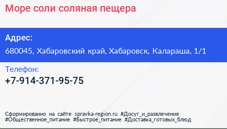 Море соли, соляная пещера по адресу 680045, Хабаровский край, Хабаровск, Калараша, 1/1 в дальнейшем Организация, размещена в следующих категориях: