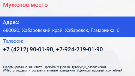 Мужское место по адресу 680020, Хабаровский край, Хабаровск, Гамарника, 6 в дальнейшем Организация, размещена в следующих категориях: