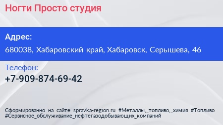 Ногти Просто, студия по адресу 680038, Хабаровский край, Хабаровск, Серышева, 46 в дальнейшем Организация, размещена в следующих категориях: