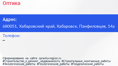 Оптика по адресу 680051, Хабаровский край, Хабаровск, Панфиловцев, 14а в дальнейшем Организация, размещена в следующих категориях: