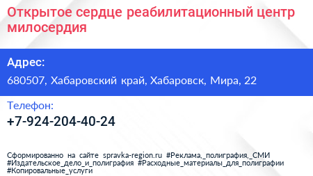 Открытое сердце, реабилитационный центр милосердия по адресу 680507, Хабаровский край, Хабаровск, Мира, 22 в дальнейшем Организация, размещена в следующих категориях: