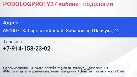 PODOLOGPROFY27, кабинет подологии по адресу 680007, Хабаровский край, Хабаровск, Шевчука, 42 в дальнейшем Организация, размещена в следующих категориях: