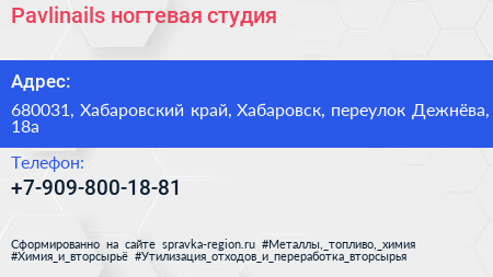 Pavlinails, ногтевая студия по адресу 680031, Хабаровский край, Хабаровск, переулок Дежнёва, 18а в дальнейшем Организация, размещена в следующих категориях: