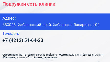 Подружки, сеть клиник по адресу 680028, Хабаровский край, Хабаровск, Запарина, 104 в дальнейшем Организация, размещена в следующих категориях: