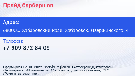 Прайд, барбершоп по адресу 680000, Хабаровский край, Хабаровск, Дзержинского, 4 в дальнейшем Организация, размещена в следующих категориях: