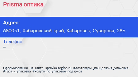 Prisma, оптика по адресу 680051, Хабаровский край, Хабаровск, Суворова, 28Б в дальнейшем Организация, размещена в следующих категориях: