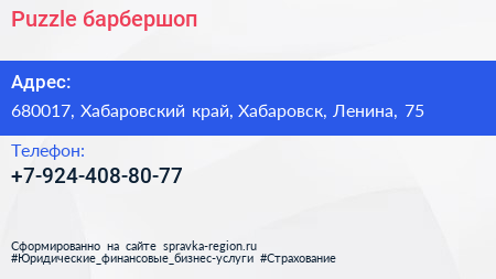 Puzzle, барбершоп по адресу 680017, Хабаровский край, Хабаровск, Ленина, 75 в дальнейшем Организация, размещена в следующих категориях: