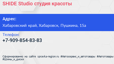 SHIDE Studio, студия красоты по адресу Хабаровский край, Хабаровск, Пушкина, 15а в дальнейшем Организация, размещена в следующих категориях: