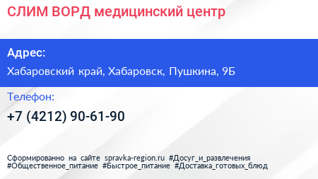 СЛИМ ВОРД, медицинский центр по адресу Хабаровский край, Хабаровск, Пушкина, 9Б в дальнейшем Организация, размещена в следующих категориях: