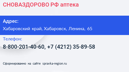 СНОВАЗДОРОВО.РФ, аптека по адресу Хабаровский край, Хабаровск, Ленина, 65 в дальнейшем Организация, размещена в следующих категориях: