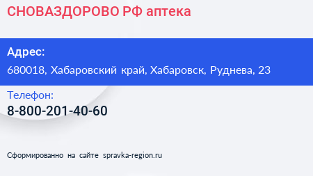 СНОВАЗДОРОВО.РФ, аптека по адресу 680018, Хабаровский край, Хабаровск, Руднева, 23 в дальнейшем Организация, размещена в следующих категориях: