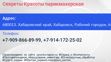 Секреты Красоты, парикмахерская по адресу 680013, Хабаровский край, Хабаровск, Рабочий городок, 6а в дальнейшем Организация, размещена в следующих категориях: