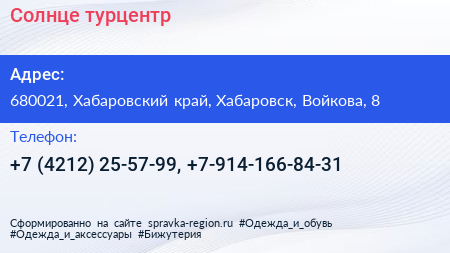 Солнце, турцентр по адресу 680021, Хабаровский край, Хабаровск, Войкова, 8 в дальнейшем Организация, размещена в следующих категориях:
