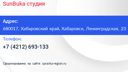 SunBuka, студия по адресу 680017, Хабаровский край, Хабаровск, Ленинградская, 23 в дальнейшем Организация, размещена в следующих категориях:
