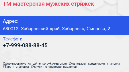 ТМ, мастерская мужских стрижек по адресу 680012, Хабаровский край, Хабаровск, Сысоева, 2 в дальнейшем Организация, размещена в следующих категориях:
