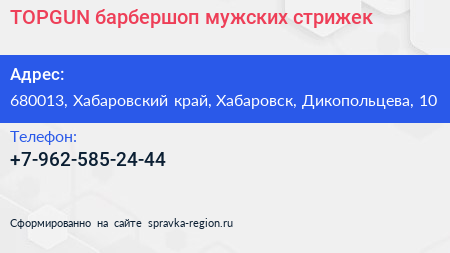 TOPGUN, барбершоп мужских стрижек по адресу 680013, Хабаровский край, Хабаровск, Дикопольцева, 10 в дальнейшем Организация, размещена в следующих категориях: