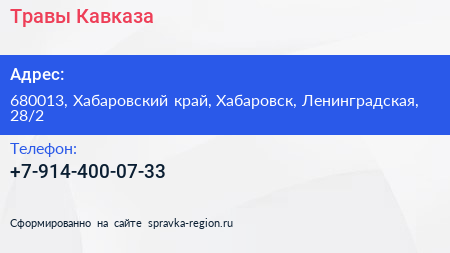 Травы Кавказа по адресу 680013, Хабаровский край, Хабаровск, Ленинградская, 28/2 в дальнейшем Организация, размещена в следующих категориях: