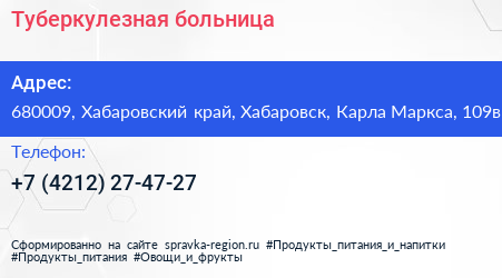 Туберкулезная больница по адресу 680009, Хабаровский край, Хабаровск, Карла Маркса, 109в в дальнейшем Организация, размещена в следующих категориях: