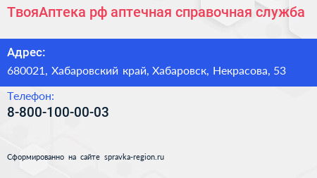 ТвояАптека.рф, аптечная справочная служба по адресу 680021, Хабаровский край, Хабаровск, Некрасова, 53 в дальнейшем Организация, размещена в следующих категориях: