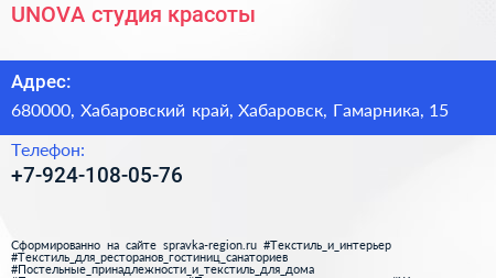 UNOVA, студия красоты по адресу 680000, Хабаровский край, Хабаровск, Гамарника, 15 в дальнейшем Организация, размещена в следующих категориях: