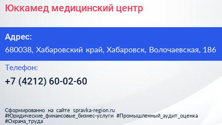 Юккамед, медицинский центр по адресу 680038, Хабаровский край, Хабаровск, Волочаевская, 186 в дальнейшем Организация, размещена в следующих категориях: