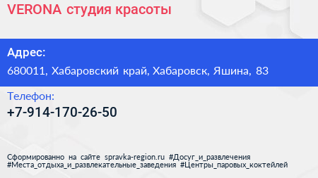 VERONA, студия красоты по адресу 680011, Хабаровский край, Хабаровск, Яшина, 83 в дальнейшем Организация, размещена в следующих категориях: