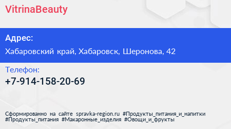 VitrinaBeauty по адресу Хабаровский край, Хабаровск, Шеронова, 42 в дальнейшем Организация, размещена в следующих категориях: