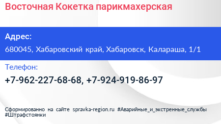 Восточная Кокетка, парикмахерская по адресу 680045, Хабаровский край, Хабаровск, Калараша, 1/1 в дальнейшем Организация, размещена в следующих категориях: