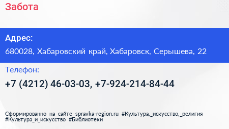 Забота по адресу 680028, Хабаровский край, Хабаровск, Серышева, 22 в дальнейшем Организация, размещена в следующих категориях: