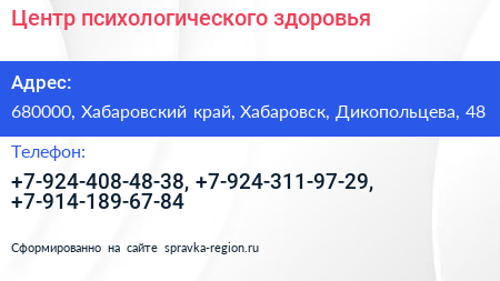 Центр психологического здоровья по адресу 680000, Хабаровский край, Хабаровск, Дикопольцева, 48 в дальнейшем Организация, размещена в следующих категориях: