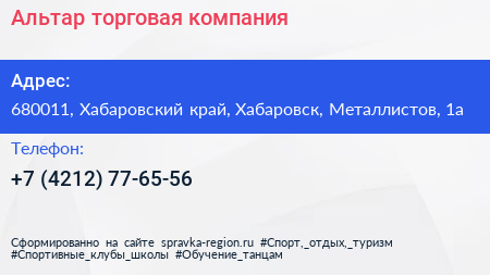 Альтар, торговая компания по адресу 680011, Хабаровский край, Хабаровск, Металлистов, 1а в дальнейшем Организация, размещена в следующих категориях: