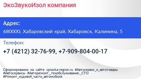 ЭкоЗвукоИзол, компания по адресу 680000, Хабаровский край, Хабаровск, Калинина, 5 в дальнейшем Организация, размещена в следующих категориях: