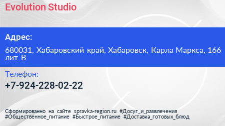Evolution Studio по адресу 680031, Хабаровский край, Хабаровск, Карла Маркса, 166 лит В в дальнейшем Организация, размещена в следующих категориях: