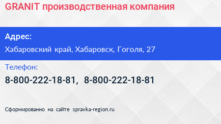 GRANIT, производственная компания по адресу Хабаровский край, Хабаровск, Гоголя, 27 в дальнейшем Организация, размещена в следующих категориях:
