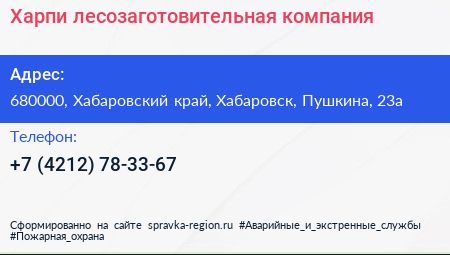 Харпи, лесозаготовительная компания по адресу 680000, Хабаровский край, Хабаровск, Пушкина, 23а в дальнейшем Организация, размещена в следующих категориях: