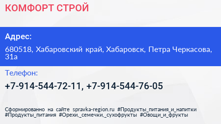 КОМФОРТ-СТРОЙ по адресу 680518, Хабаровский край, Хабаровск, Петра Черкасова, 31а в дальнейшем Организация, размещена в следующих категориях: