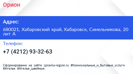 Орион по адресу 680021, Хабаровский край, Хабаровск, Синельникова, 20 лит А в дальнейшем Организация, размещена в следующих категориях: