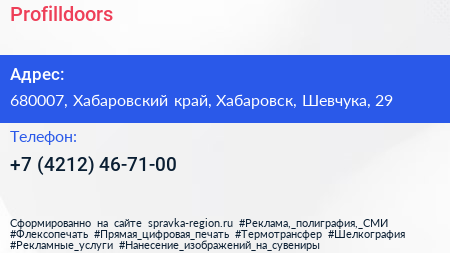 Profilldoors по адресу 680007, Хабаровский край, Хабаровск, Шевчука, 29 в дальнейшем Организация, размещена в следующих категориях: