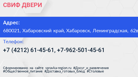 СВИФ ДВЕРИ по адресу 680021, Хабаровский край, Хабаровск, Ленинградская, 62в в дальнейшем Организация, размещена в следующих категориях: