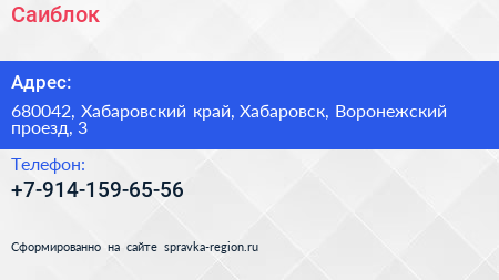 Саиблок по адресу 680042, Хабаровский край, Хабаровск, Воронежский проезд, 3 в дальнейшем Организация, размещена в следующих категориях: