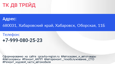 ТК-ДВ-ТРЕЙД по адресу 680031, Хабаровский край, Хабаровск, Оборская, 11Б в дальнейшем Организация, размещена в следующих категориях: