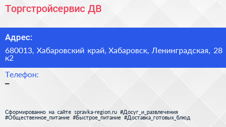 Торгстройсервис-ДВ по адресу 680013, Хабаровский край, Хабаровск, Ленинградская, 28 к2 в дальнейшем Организация, размещена в следующих категориях: