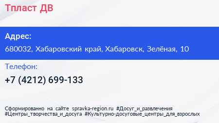 Тпласт-ДВ по адресу 680032, Хабаровский край, Хабаровск, Зелёная, 10 в дальнейшем Организация, размещена в следующих категориях: